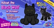 The Black Wolf is a Webkinz pet that was released in September 2012. It doesn't have a Lil'Kinz version. It was Pet of the Month in October 2013. It isn't retired. Its pet specific item is the Comrade Couch and its pet specific food is Beef and Black Bean Stew