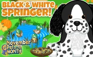 The Black and White Springer is a Webkinz pet. It doesn't have a Lil'Kinz version. Its pet specific item is the Decoy Pond, and its special food is the Hunter’s Trail Mix.