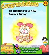 The Carrots Bunny is a Webkinz pet that was released in February 2014. It doesn't have a Lil'Kinz version. It was Pet of the Month in April 2017. It isn't retired. Its pet specific item is the Springtime Clock and its pet specific food is Carrot Cake Crepes.