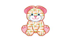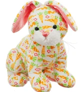 The Carrots Bunny is white with an orange, yellow, green, and pink carrots and flowers pattern. It has blue eyes with large pupils. Its tail, cheeks, and whiskers are white. Its nose is pink.