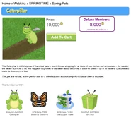 The Caterpillar in a Webkinz pet that was released in September 2009. It was Pet of the Month for March 2011. Its pet specific food is the Leafy Layer Cake and its pet specific items are the Butterfly Costume and the Butterfly Antenna (2009).
