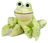 The Flower Frog is white with flowers in various shades of bright green covering its body. It has a light green belly and light yellow under its mouth. Its large eyes are green plastic with bright green eyelids. The virtual pet appears to be light green as a base color rather than white.