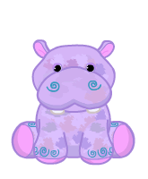 The Hippie Hippo has smooth light purple fur. It has blue swirls as toenails and nostrils. It has a blue heart with a peace sign and two flowers on it on its back. It has to big white front teeth. The Hippie Hippo has stubby, thick legs and a short tail.