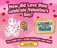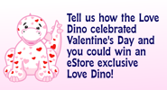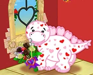 The Love Dino is a Webkinz eStore pet that does not have a Lil'Kinz. It was February 2021 Pet of the Month and it is retired. Its pet special food is the Beautiful Bon Bon Bouquet and its pet specific item is the Cloud Nine Window.