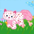 The Lovely Love Kitten is white with pink and red hearts all over its body. It has long pink fur on its chest, belly, and tail. The insides of its ears and the bottoms of its paws are hot pink. It has blue eyes with large black pupils. Its nose is pink.