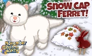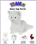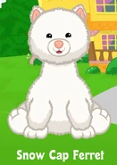 The Snow Cap Ferret is a Webkinz pet that released in November 2016. It doesn't have a Lil'Kinz, it isn't retired, and it was Pet of the Month for November 2018. Its pet specific item is the Cozy Snow Burrow Bed and its pet specific food is the Cinnabunny Creamsicle.