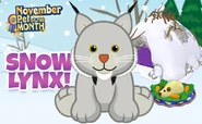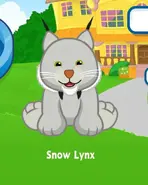 The Snow Lynx is a Webkinz pet that was released in September of 2017. It is not retired, does not have a Lil'Kinz, and was Pet of the Month in November of 2022. Its pet specific food is the Snowshoe Pear, and its pet specific item is the Snowy Den.