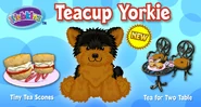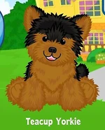 The Teacup Yorkie is a regular Webkinz pet that was released in October 2013. Its pet specific food is Tiny Tea Scones and its pet specific item is the Tea for Two Table.