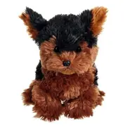 The teacup yorkie has long brown and black fur all over its body, with black fur on the top of its head, ears, tail, and back, with brown fur everywhere else. It has a black nose and eyes.