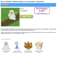 The Webkinz Walrus was released in July 2009. It has been November 2011's Pet of the Month, it's not retired, and doesn't have a Lil'Kinz version. Its pet specific item is the Northern Lights Lamp and its pet special Food is One Ton Won Tons.