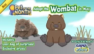 The Wombat is a Webkinz pet that was released in October 2010. It was Pet of the Month in May 2012, and doesn't have a Lil'Kinz. Its pet specific item is the Down Under Burrow and its pet specific food is the Tasmanian Tree Tarts.